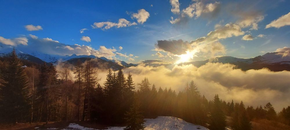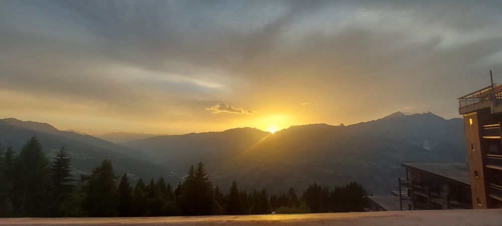 • Un balcon avec une magnifique vue dégagée sur le vallée de la tarentaise avec une table bistrot et 2 chaises ainsi qu'un transat